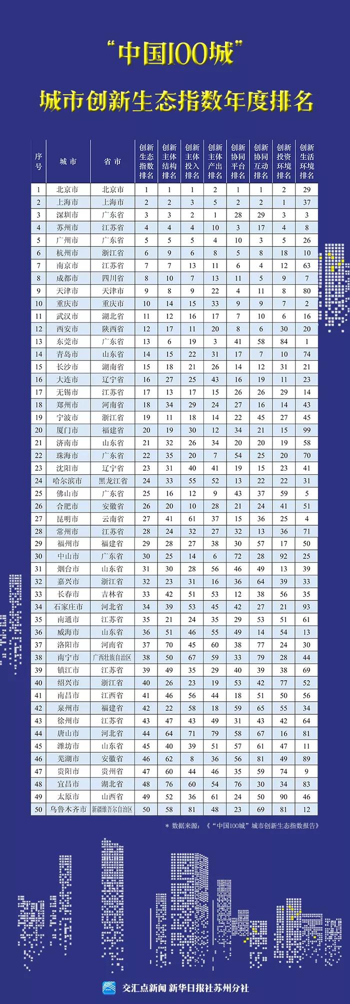 在创新驱动新时代,城市体现出前所未有的引领作用。《“中国100城”城市创新生态指数报告》就是为城市引领时代量身定制的参考要件。受指数报告联合研究团队委托,交汇点新闻独家发布指数报告系列指数排名,开篇重磅发布“中国100城”城市创新生态指数年度排名50强。