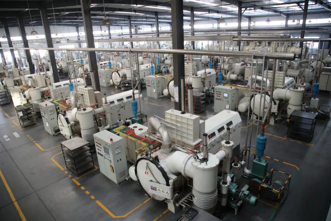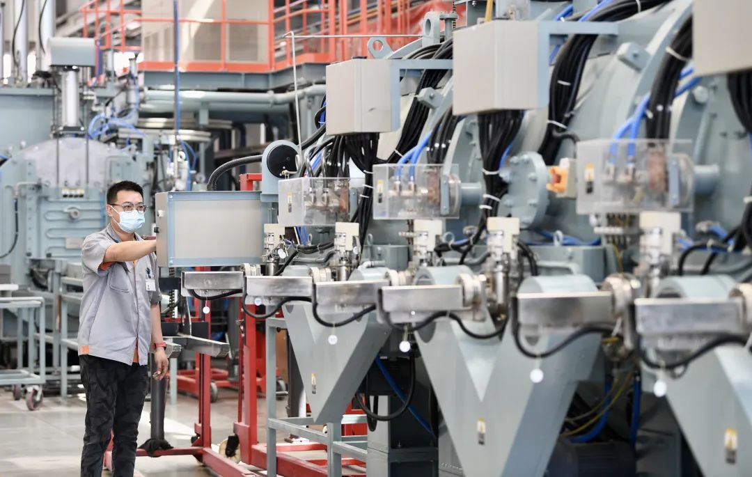 在包头市稀土高新区大地熊(包头)永磁科技有限公司生产车间内,技术人员查看设备运行情况。