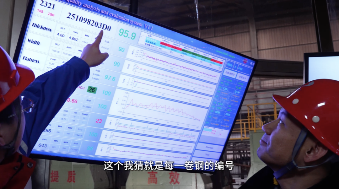 “这是我们自己研发的带钢质量监控系统,每一片钢的厚度都有打分,这是宽度打分,这是板型平直度打分。”