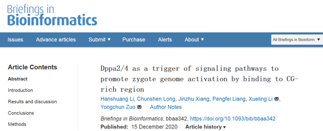 近日,省部共建草原家畜生殖调控与繁育国家重点实验室左永春教授课题组和李雪玲教授课题组合作在国际生物信息学权威期刊《生物信息学简介》(Briefings in Bioinformatics)上发表了题为“Dppa2/4作为信号通路的触发器,通过与CG富集区结合促进合子基因组激活”(Dppa2/4 as a trigger of signaling pathways to promote zygote genome activation by binding to CG-rich region)”的最新科研成果。该研究成果,详细阐述了Dppa2/4调控胚胎基因组激活的分子生物学途径。