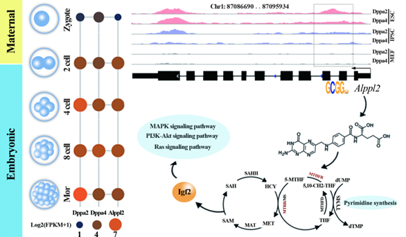 该科研团队深入挖掘了Dppa2/4在ZGA过程中的作用机制,发现Dppa2/4通过与近端启动子的富含CG的区域(0-500 bp)结合来调节大多数信号通路,其中包括ZGA的决定性信号通路,如Hippo、MAPK和TGF-beta信号通路等。另外这两个因子在调节细胞多能性方面具有协同调控作用,二者的同时过表达可以使诱导多能性干细胞更接近胚胎干细胞。在Dppa2/4单敲或双敲除的胚胎干细胞中,除了已经证明是Dppa2/4下游靶基因的Dux被完全沉默外,Alppl2的表达同样被完全沉默,表明Alppl2可能是除了Dux以外Dppa2/4的另一个新的下游因子。科研团队利用免疫荧光染色显示Alppl2在小鼠ZGA过程中显著激活,进一步表明Alppl2可能作为ZGA信号通路的候选驱动因子直接由Dppa2/4调控,进而促进植入前胚胎发育。
