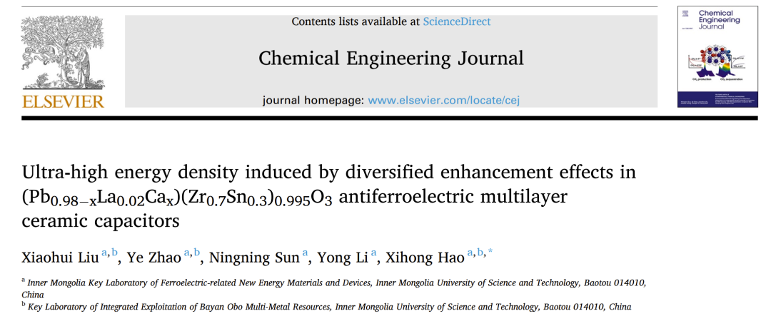 近日,内蒙古科技大学郝喜红教授课题组在国际高水平期刊《化学工程杂志》(Chemical Engineering Journal)上发表了题目为“通过多元化增强策略在(Pb0.98-xLa0.02Cax)(Zr0.7Sn0.3)0.995O3反铁电多层陶瓷电容器中获得超高能量密度”(Ultra-high energy density induced by diversified enhancement effects in (Pb0.98-xLa0.02Cax)(Zr0.7Sn0.3)0.995O3 antiferroelectric multilayer ceramic capacitors)的最新科研成果。该研究对介电储能材料的设计具有普遍意义和实践价值。