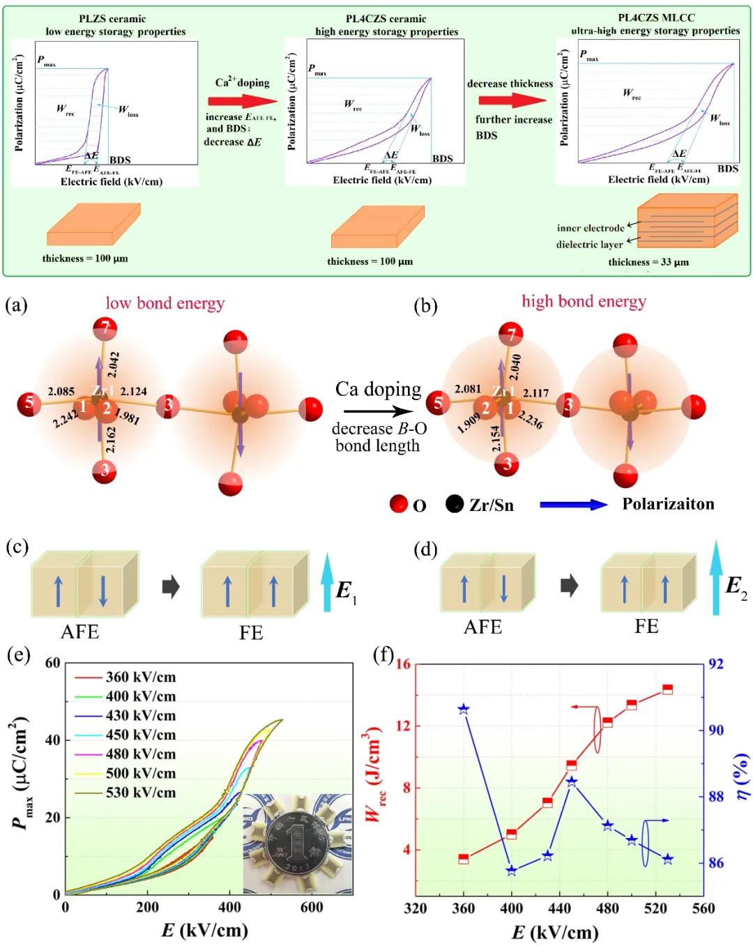 科研团队通过离子掺杂和多层构造的策略来调节(Pb0.98-xLa0.02Cax)(Zr0.7Sn0.3)0.995O3反铁电陶瓷材料的化学键结构、晶体结构和微观结构。首先,Ca²﹢离子的掺杂可以细化晶粒和增强阳离子和氧的结合,从而增强击穿强度和相转变电场。其次,通过多层结构减少因电介质层厚度引起的缺陷来进一步提高击穿电场。最终,采用多元化增强策略成功制备出了超高的储能密度(14.3 J/cm³),高的储能效率(86.1%),高的放电能量密度(10.7 J/cm³)和高功率密度(400 MW/cm³)的铅基反铁电多层陶瓷电容器。这项工作强调了基于结构设计来提高反铁电材料能量密度,这种新颖的策略可以为储能材料的设计提供指导。