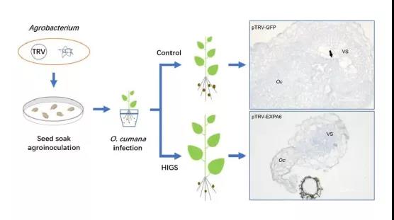 研究团队进一步对OcEXPA6的功能研究发现,OcEXPA6能被萌发刺激物GR24和吸器诱导因子DMBQ诱导,说明该基因可能在寄生过程被诱导表达。通过毛根转化,OcEXPA6在苜蓿中过表达时表现出根长变短的现象;同时OcEXPA6定位在细胞膜上,说明OcEXPA6可能通过利用细胞壁的重编程来抑制根的发育。
