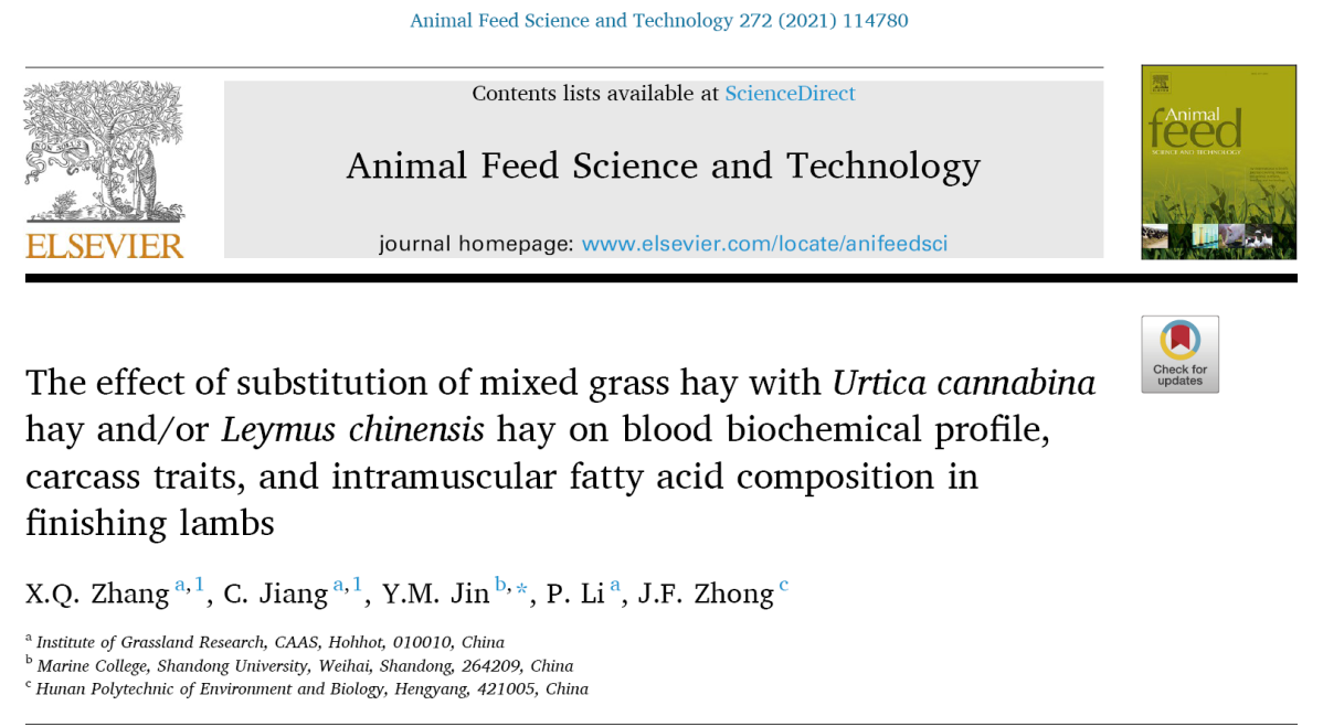 近期,中国农业科学院草原研究所(内蒙古草业与草原研究院)张晓庆研究员团队在国际期刊《动物饲料科技》(Animal Feed Science and Technology)上发表了“荨麻干草或羊草干草替代混合草干草对育成羔羊血液生化、胴体性状和肌内脂肪酸组成的影响”(The effect of substitution of mixed grass hay with Urtica cannabina hay and/or Leymus chinensis hay on blood biochemical profile, carcass traits, and intramuscular fatty acid composition in finishing lambs)的最新研究成果。该研究成果,以荨麻干草或羊草干草替代混合草干草对育成羔羊血液代谢产物、胴体性状和肌内脂肪酸组成产生了影响,能有效改善育肥羔羊血液生化指标,提高肉质脂肪酸含量。