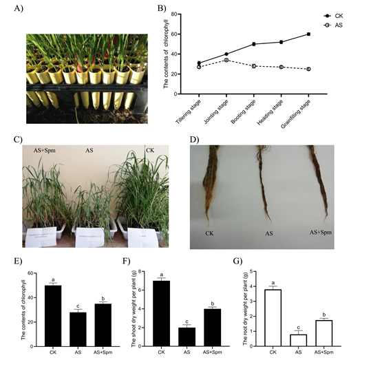 注:(A)Con-tainer种植;(B)碱胁迫对不同生育时期叶片叶绿素含量影响机制;孕穗期,外源精胺对碱胁迫下燕麦(C)地上部分及(D)根系生长影响效应;孕穗期,外源精胺对碱胁迫下(E)叶片叶绿素含量、(F)地上部分干物质重及(G)根干重影响效应。CK:对照,AS:碱胁迫,Spm:外源精胺