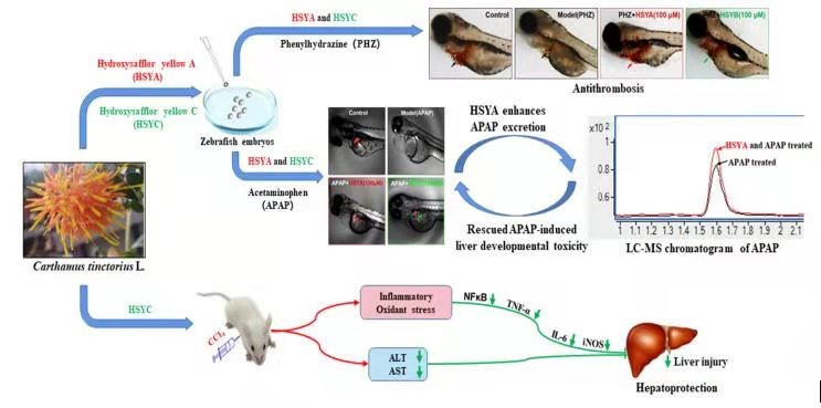 研究团队发现,红花的主要成分—羟基红花黄色素能够有效改善对乙酰氨基酚(APAP)诱导的肝毒性损伤,能够加速毒素物质的排泄,改善APAP诱导的斑马鱼形态畸形和肝脏发育迟缓。还可以显著保护四氯化碳诱导的小鼠急性肝损伤,逆转四氯化碳导致的转氨酶活力的升高和相关炎性蛋白高表达。羟基红花黄色素具有较强的抗血瘀能力,能够有效改善斑马鱼尾静脉血栓斑块堵塞、提高血液流速、增加心脏红细胞数量。进一步研究发现羟基红花黄色素能够改善由APAP和苯肼诱导的斑马鱼双重损伤。