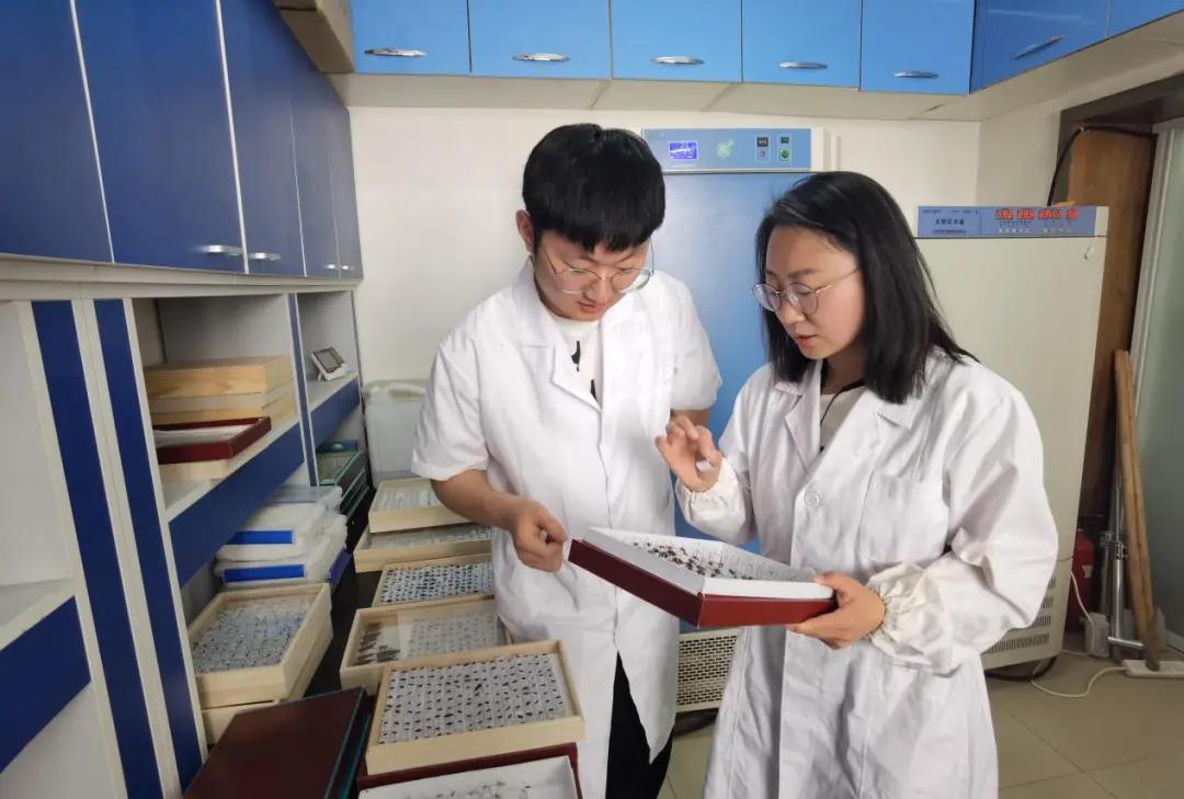 图:王宁(右)和研究生整理昆虫标本
