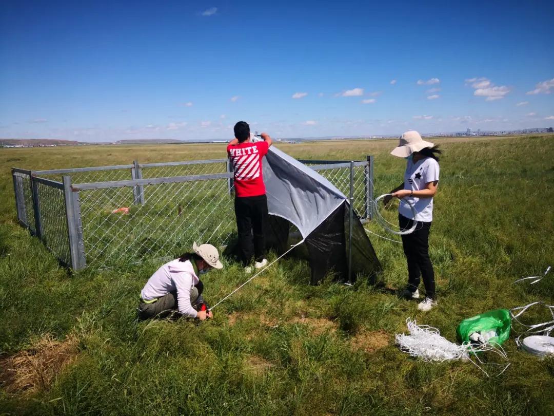 图:王宁和草原站工作人员一起在固定监测点架马氏网进行昆虫的收集