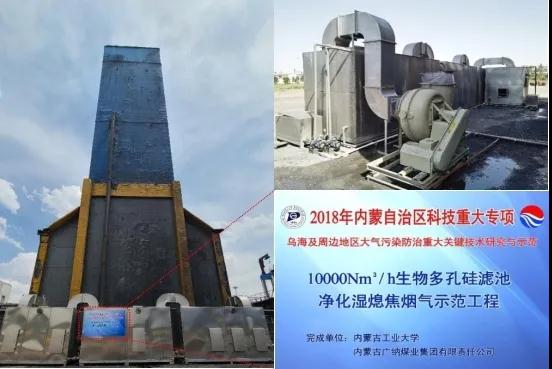 目前内蒙古工业大学科研团队已经在乌海广纳煤焦化有限公司建设了两套高温工业烟气治理示范工程,分别为“年产100万吨焦化企业净化高温工业烟气非常规污染物配套10000Nm³/h反应式袋式除尘器协同净化焦炉烟气示范工程”和“10000Nm³/h生物多孔硅滤池净化湿熄焦烟气示范工程”,目前两个示范工程均已完成中试试验,运行效果良好。