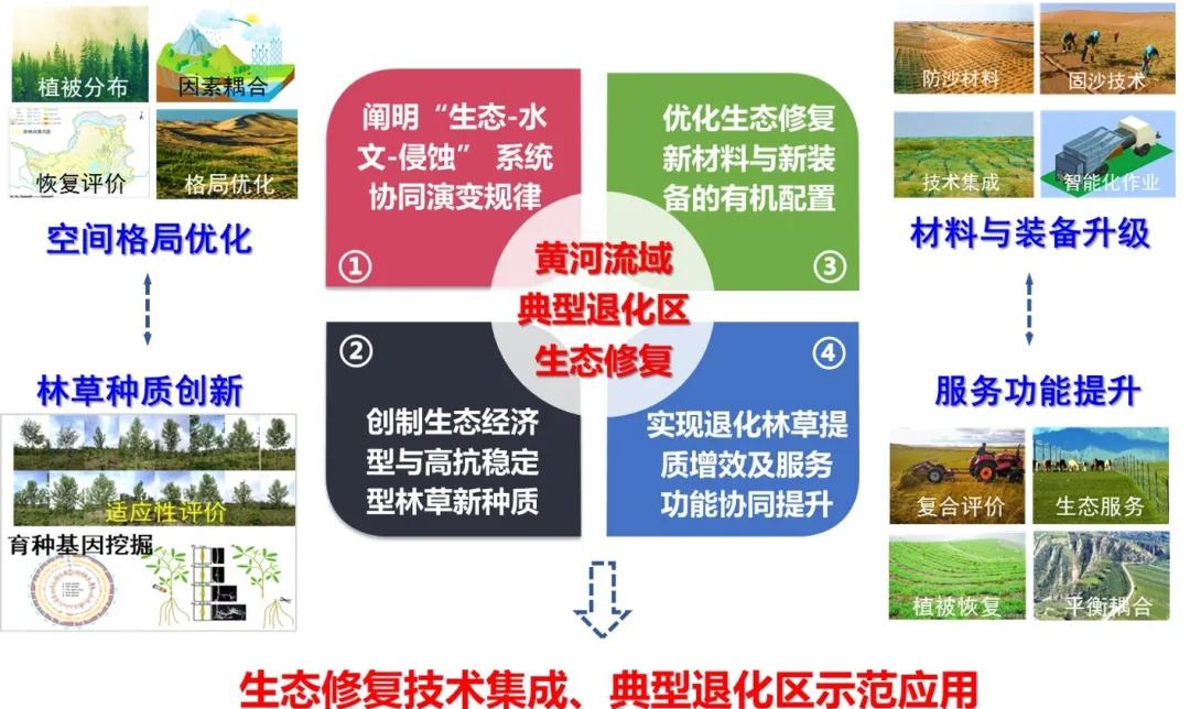——研发兼具环境友好和可持续特征的生态修复新材料,创制具有适应流域地形和退化土地特点的新装备,实现林灌草与生态修复新材料、新装备的有机配置,建立林草植被高效恢复技术体系;