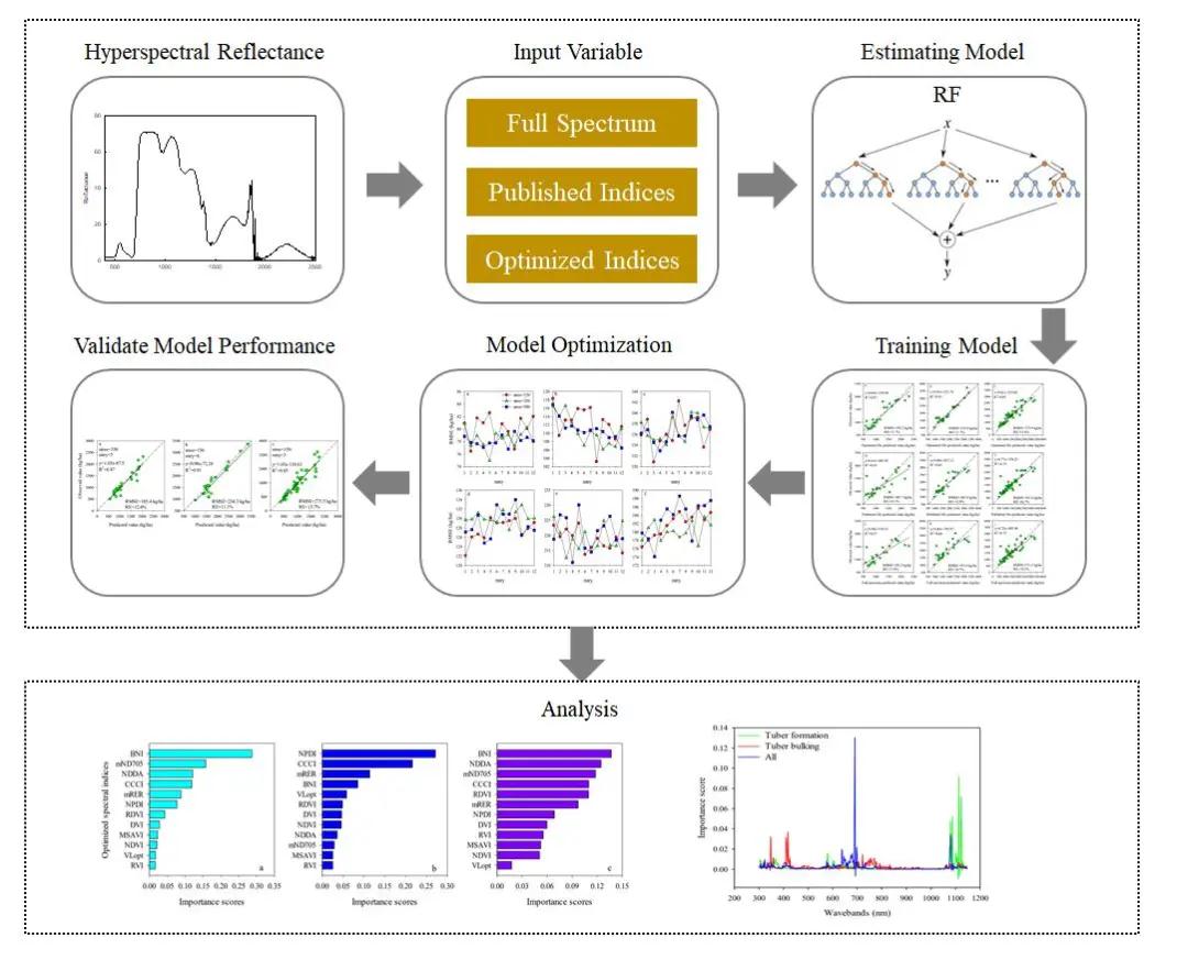 科研团队探究了光谱指数算法对作物冠层氮素含量预测的影响,通过对光谱指数波段和方程形式的优化设计,发展了适用于小麦、玉米和马铃薯的优化光谱指数,有效地提高了作物冠层氮素含量预测的稳定性和精确度。与此同时,科研团队还提出了能够准确估测作物生物量的机器学习模型,并在马铃薯营养生长期植株生物量估测研究中得到了有效的验证。这些研究结果为作物氮素营养诊断及生物量实时监测提供了新的方法,为智慧农业发展过程中传感器的设计提供了理论基础,推动了智慧农业的发展。