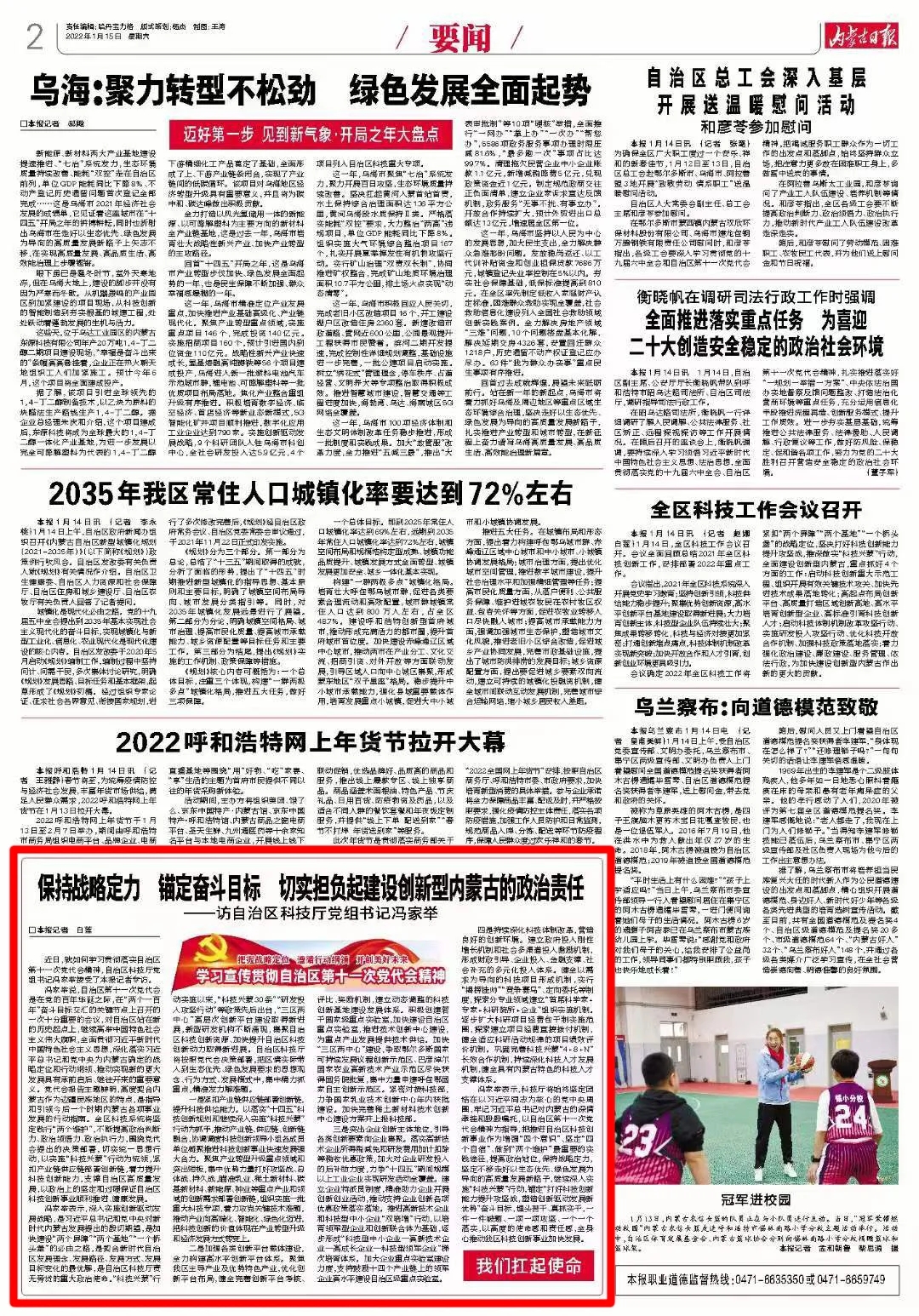 自治区第十一次党代会是在党的百年华诞之际,在“两个一百年”奋斗目标交汇的关键节点上召开的一次十分重要的会议,对自治区站在新的历史起点上,继续高举中国特色社会主义伟大旗帜,全面贯彻习近平新时代中国特色社会主义思想,深化落实习近平总书记和党中央为内蒙古确定的战略定位和行动纲领、推动实现新的更大发展具有承前启后、继往开来的重要意义。党代会报告主题鲜明,高度契合内蒙古作为边疆民族地区的特点,是指导和引领今后一个时期内蒙古各项事业发展的行动指南。全区科技系统将坚定践行“两个维护”,不断提高政治判断力、政治领悟力、政治执行力,围绕党代会提出的决策部署,切实统一思想行动,以实施“科技兴蒙”行动为统领,紧扣产业链供应链部署创新链,着力提升自治区科技创新能力,支撑自治区高质量发展,以政治上的坚定和过硬保证自治区科技创新事业顺利推进、健康发展。