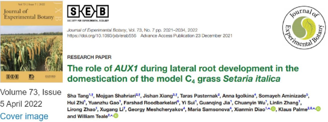 近日,赤峰学院相吉山研究员科研团队与中国农业科学院作物科学研究所刁现民研究员团队、德国弗莱堡大学等合作在国际植物科学经典期刊《Journal of Experimental Botany》(IF=6.992)以封面文章形式在线发表了关于调控谷子穗部及侧根发育的重要基因SiAUX1的功能最新研究成果。