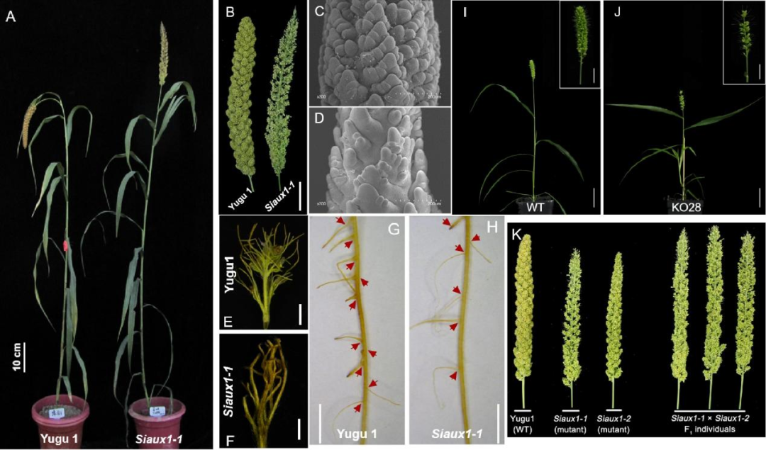 A:野生型豫谷1号与突变体siaux1-1的植株表型;B:豫谷1号与siaux1-1的穗型;C-D:豫谷1号与siaux1-1幼穗中部的扫描电镜照片;E-F:豫谷1号与siaux1-1的穗基部分枝;G-H:豫谷1号与siaux1-1的根系表型;I-J:野生型与CRISPR/Cas9敲除SiAUX1基因株系的表型;K:豫谷1号、siaux1-1、siaux1-2及siaux1-1×siaux1-2杂交F₁代的穗部表型