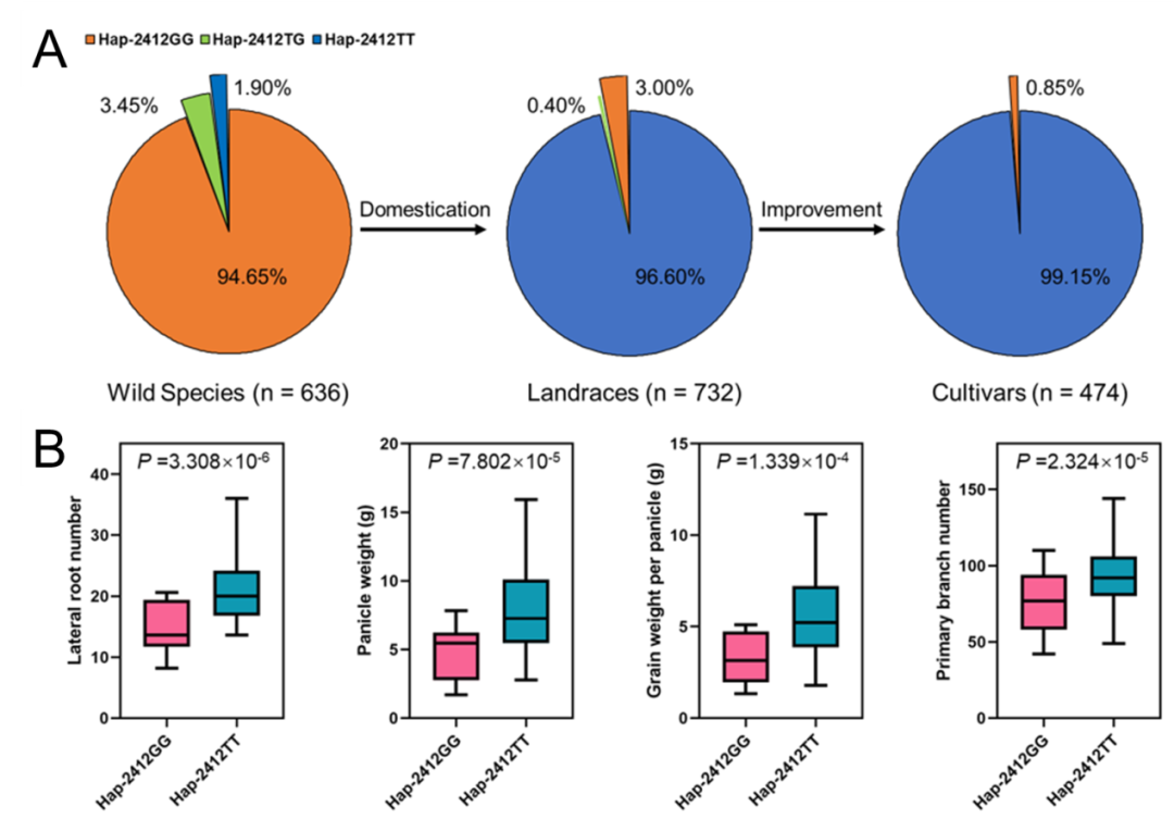 A:SiAUX1单倍型在谷子自然群体中的频率分布;B:谷子和狗尾草自然群体Hap-2412GG和Hap-2412TT等位基因的表型分析