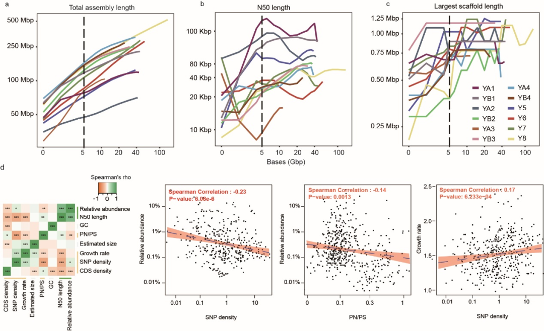 科研团队采用二代、三代测序技术相结合的深度宏基因组测序方法,通过优化宏基因组装配性能获得了超高质量的肠道微生物基因组,包括含量低至0.1%-1%的低丰度物种和含量小于0.1%的极低丰度物种。分析结果表明低丰度和特低丰度物种的编码密度、pN/pS比和SNP密度高于高丰度物种,高丰度物种具有更多的可移动遗传原件,表明肠道环境中低丰度物种存在较强的选择压力,反映了肠道物种间的相互作用和生态位适应。