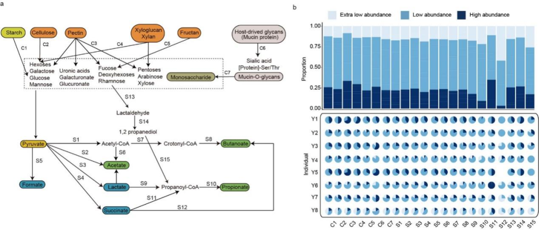 科研团队通过重构肠道微生物的关键代谢途径,在个体水平研究了不同丰度肠道微生物的功能网络互作,发现低丰度物种可能是肠道多糖代谢和短链脂肪酸合成的积极参与者,表明它们可能在肠道微生物群落中发挥特定的作用,并对宿主作出积极贡献。该研究为探索人类肠道中低丰度物种的基因组和功能特征提供了有效框架,同时明确了低丰度的物种在解析肠道生态和肠道微生物群的功能中的重要作用,为个性化肠道菌群研究提供了新思路。