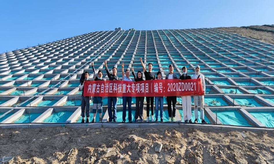 据项目负责人内蒙古工业大学张永锋教授介绍:“在项目实施过程中,集成与示范了超旱生腾格里无芒隐子草新品种、钢筋混凝土框架梁联合土工绿植垫、基于固废综合利用的保水缓释土壤改良剂、图像全景拼接软件等一系列拥有自主知识产权的重要技术成果。截至目前已超额完成生态修复面积23万平方米,共进行了11种边坡防护模式,16种土壤改良模式,16种草灌结合、6种禾豆结合、1种矮乔与草结合等建植模式的研发工作。”