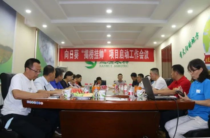 项目启动会上,创新联合体共建单位进一步讨论了向日葵“揭榜挂帅”项目课题及任务目标,并分解各成员单位及课题组的任务,全面明确目标和责任。项目牵头单位三瑞农科与各成员单位签订了合作共建协议及课题任务书。