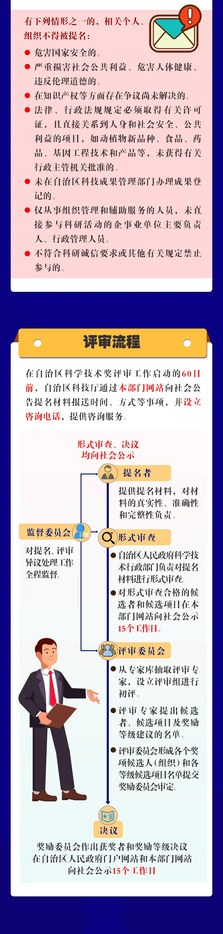(8)加强了评审管理。实行了公示公告制度,提出了在不同阶段的公示主体与公示期。明确了在自治区科技奖评审工作启动的60日前,通过本部门网站向社会公告提名通知,主动接受社会监督。监督委员会对评审工作全程进行监督,开展异议处理,并向奖励委员会报告工作等,进一步增强了科技奖励工作的透明度和公信力。