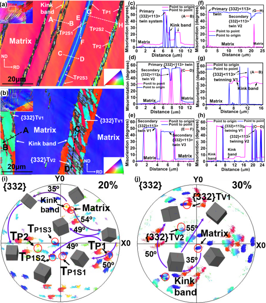 20%和30%变形量下的扭折带、{332}<113>初始孪晶和变体孪晶
