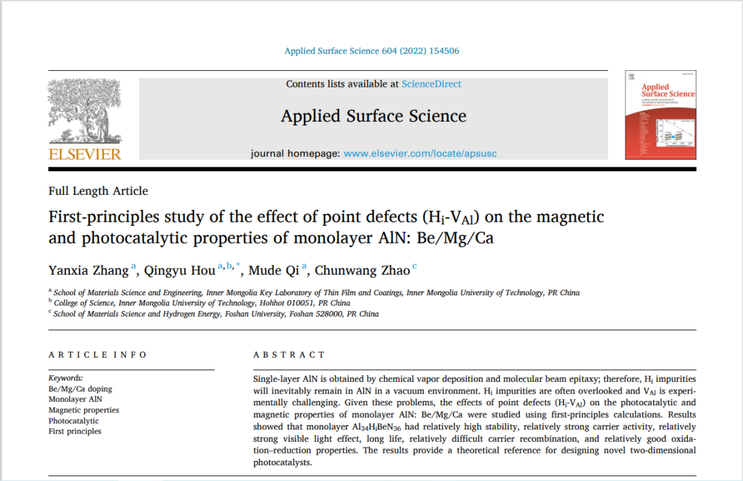 近日,内蒙古工业大学侯清玉教授科研团队在单层AlN掺杂体系光催化性能研究中取得新进展,相关研究成果“点缺陷(Hi-VAl)对单层AlN:Be/Mg/Ca磁性和光催化性能影响的第一原理研究”[First-principles study of the effect of point defects (Hi-VAl) on the magnetic and photocatalytic properties of monolayer AlN: Be/Mg/Ca],发表于国际期刊《应用表面科学》(Applied Surface Science)。科研团队研究发现,单层Al34HiBeN36更适合用作光催化剂。