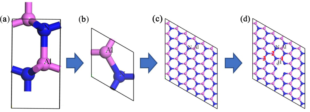 模型 (a) AlN 原胞;(b) 单层 AlN 原胞;(c) 单层 AlN 超胞;(d) 单层 Al35HiN36 和 Al34HiMN36 (M = Be, Mg, Ca)。图中1、2、3表示M(Be、Mg、Ca)和VAl的相对位置