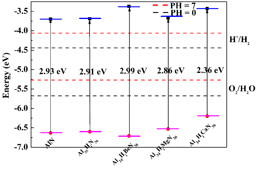 科研团队通过第一性原理计算方法,系统研究了点缺陷(Hi-VAl)对单层AlN:Be/Mg/Ca体系磁性和光催化性能的影响,从态密度和能带的计算表明,所有含杂质体系均为直接带隙半导体。同时发现,单层Al34HiBeN36体系满足杂质能级与费米能级重合或在其附近有利于陷阱作用,电子与空穴不易复合,载流子寿命相对最长。