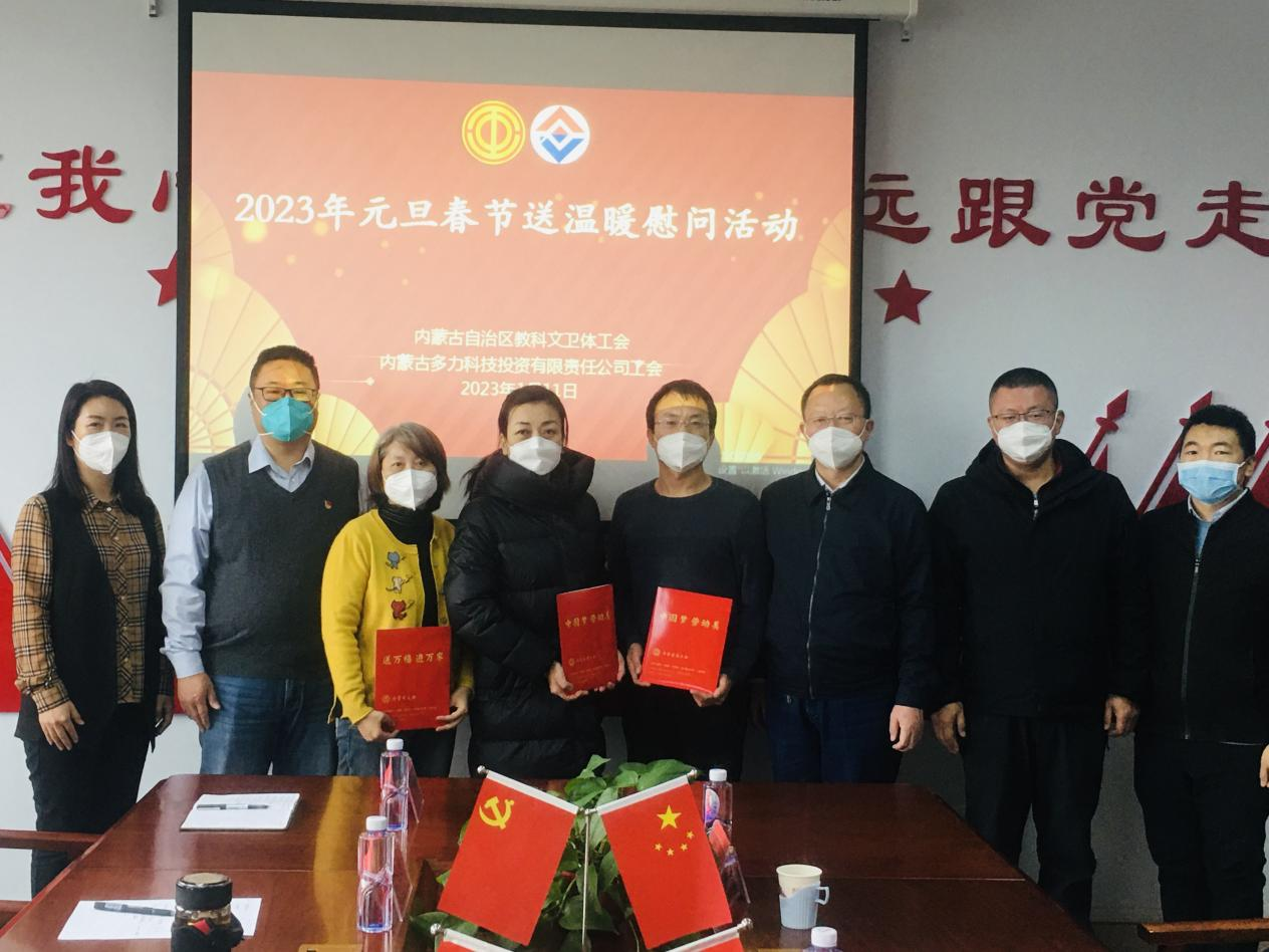 1月11日下午,内蒙古多力科技投资有限责任公司工会委员会联合自治区教科文卫体工会举办了“2023年元旦春节送温暖慰问暨中国共产党第二十次全国代表大会人才战略精神宣贯”活动。自治区教科文卫体工会主席邢亦凡、自治区教科文卫体工会三级主任科员杨超、全国先进工作者内蒙古工业大学信息工程学院院长黄平平、多力公司党支部书记马德庆、多力公司工会主席及18名职工代表共同参加了此次活动。