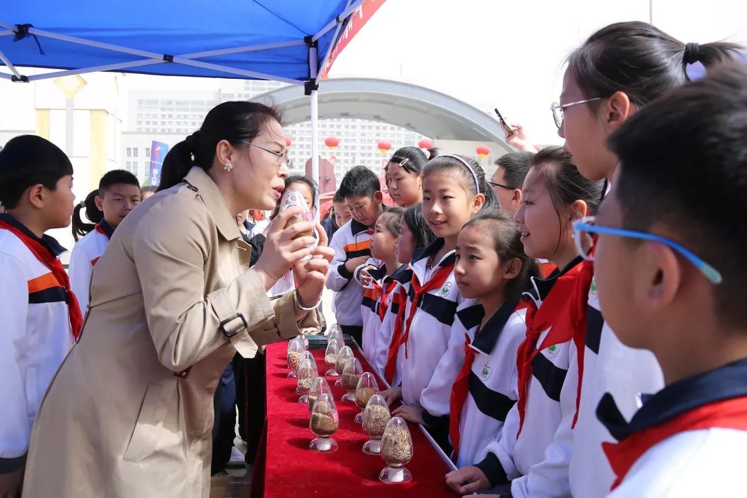 中国农科院草原研究所的科技人员现场为中小学生介绍草种业创新成果