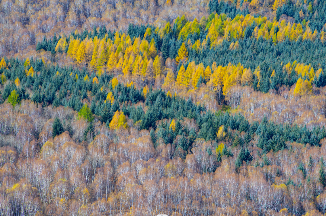 △ 沙地云杉(绿色)与华北落叶松(黄色)白桦混交造林