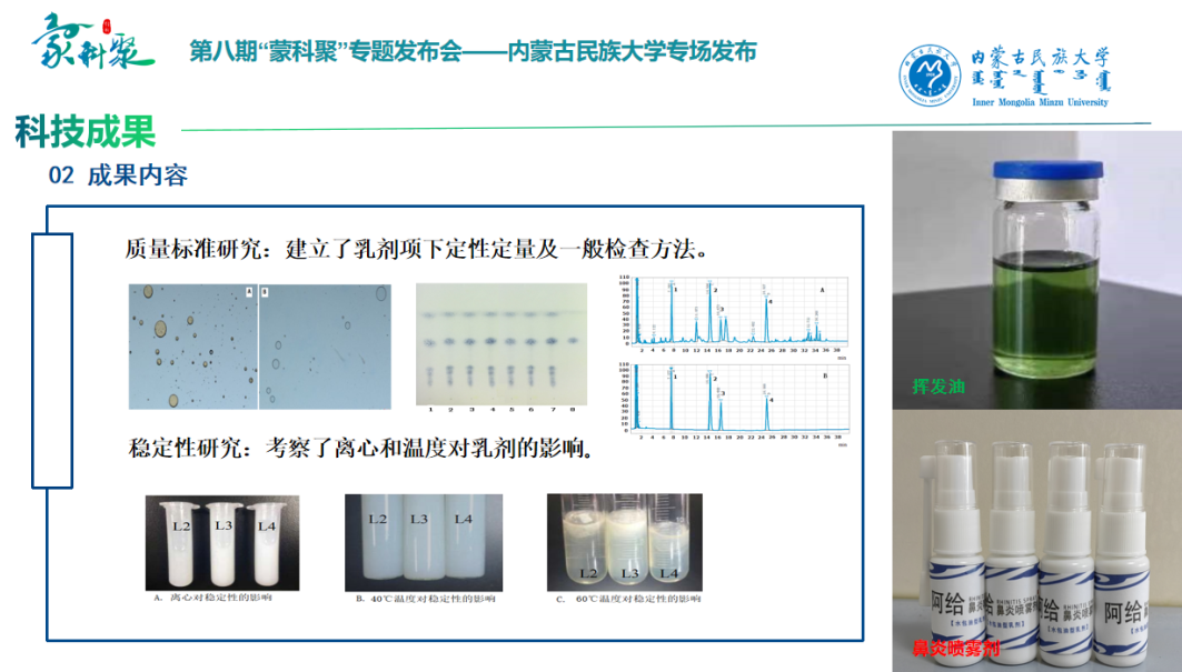 小白蒿,蒙名为阿给,系菊科蒿属植物小白蒿的地上部分,也是内蒙古道地药材之一。科研团队研究中发现患有过敏性鼻炎的患者经常接触阿给或阿给粉后,病情得以缓解。因此,团队选用引发鼻炎的常见肺炎链球菌、溶血性链球菌和金色葡萄球菌,对阿给挥发油进行了体外抗菌预试,结果表明阿给挥发油具有良好的抗菌效果。阿给鼻炎喷雾剂适用于花粉、粉尘及蒿属植物过敏的过敏性鼻炎患者。其特点纯天然无激素,原料广泛,成本低廉,安全无毒,兼具良好的流动性和粘着性,可有效地控制过敏性鼻炎患者的症状并有效降低其复发率,疗效显著,应用前景广阔。