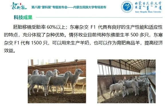 为提高东佛里生奶绵羊种羊在我区东部地区的寒冷气候及舍饲圈养养殖方式的适应能力,最大限度发挥东佛里生奶绵羊优质的泌乳性能、繁殖性能和产肉性能,科研团队通过胚胎移植技术加快东佛里生羊本土化选育速度,不断改进营养调控、疫病防控方案,选育适应本土自然资源条件的东佛里生奶绵羊群体。此外,开展东佛里生奶绵羊和小尾寒羊杂交,利用杂种优势提高杂交后代的产肉性能、泌乳性能和多羔哺育率,提高养殖户的养殖效益。