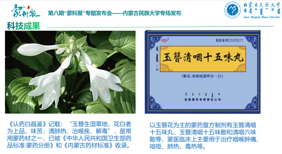 玉簪花为百合科植物玉簪的干燥花,是常用蒙药材之一,具有清热,解毒之功效,主治咽喉肿痛、音哑、肺热、毒热。目前,药物质量控制主要以测定有效成分含量为主。科研团队基于中药质量生物评价方法,对玉簪花进行研究,建立良好的中药质量生物标志物 (Q-biomarker),基于质量生物标志物开发检测质量的试剂盒,研究成果可以提高中药质量控制方法和标准与临床安全性和有效性的关联度,同时兼顾质量控制的可操作性,使用方便、成本低,市场推广前景广。
