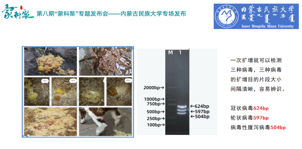 牛传染病的流行是影响我国牛业高效发展、食品安全和公共卫生的最重要因素之一。在犊牛传染病中,犊牛腹泻发病率排在第一位,由病毒引起的腹泻近几年呈上升趋势,及时、准确的病原检测显得尤为重要。科研团队多年来针对肉牛疾病开展了相应的研究工作,对犊牛腹泻病原调查、细菌的耐药性、牛呼吸道综合征及血液寄生虫等进行研究,研制出牛病毒性腹泻病毒、轮状病毒和冠状病毒多联PCR检测试剂盒,该试剂盒能同时检测引起犊牛腹泻的三种病毒,具有方便快捷、经济高效等特点,该成果获得发明专利1项,在肉牛疾病监测、病原诊断等方面具有广泛的应用前景。