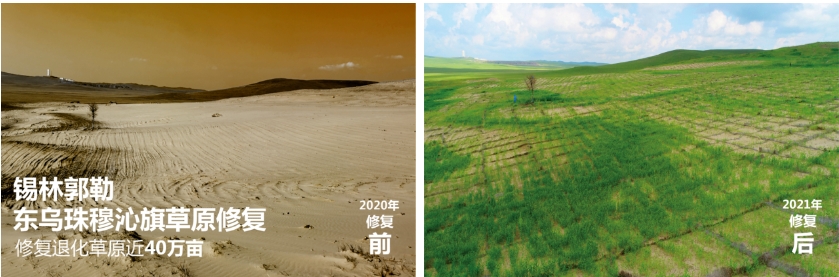 浑善达克沙地主要分布于内蒙古锡林郭勒盟、赤峰市等地,是我国四大沙地之一。多年来,蒙草科研团队围绕乡土草种配比与机械创新,研发了沙化草原补播“种子生态包”配置技术、低扰动草原生态机械化修复等技术;与中国科学院西北研究院、中国农科院草原研究所等科研院所合作,实施了“浑善达克沙地生态建设与资源高效利用技术集成与试验示范”“沙化草原生态修复和生产能力提升”“机械化治沙新技术研发与示范”“重要乡土草育种新技术研发与新品种培育推广”等自治区重点科技项目;依托“国家草业技术创新中心(筹)”“国家林业草原风蚀沙化治理工程技术研究中心”等科研平台,持续开展荒漠植物新品种选育,选育了“上都杂花苜蓿”、锡林郭勒型华北驼绒藜、东山山野豌豆、呼伦湖斜茎黄芪等新品种,转化了中苜10号紫花苜蓿、“中草27号”羊草、蒙农杂种冰草等一批适宜内蒙古不同生态环境的优良草品种,乡土种源+创新机械为大面积沙化草原修复和荒漠化治理提供了技术支持。