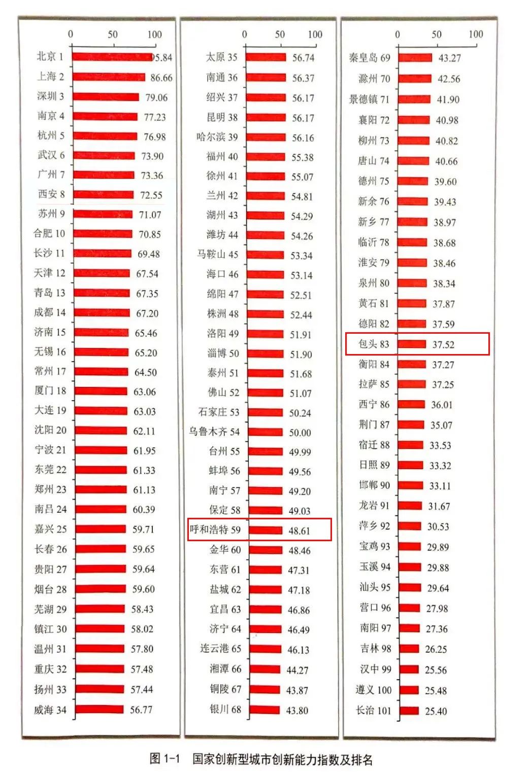 近日,中国科学技术信息研究所发布《国家创新型城市创新能力评价报告2023》。报告显示:在全国101个国家创新型城市中,我区呼和浩特市、包头市创新能力指数分别为48.61和37.52,在国家创新型城市中分别位列第59名和第83名,在全国城市创新能力百强榜单中的排名分别为第60名和第93名。此外,鄂尔多斯市凭借36.71的城市创新能力指数首次跻身全国城市创新能力百强,位次为第99名。