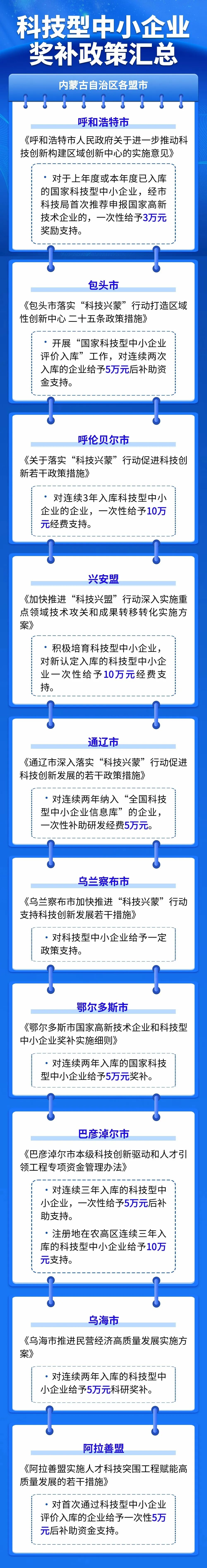 我区各盟市对科技型中小企业给予一定的奖补支持,营造更好政策环境支持科技型中小企业研发,大力提升科技型中小企业科技创新能力。本期为您整理了亚洲博彩平台排名各盟市科技型中小企业奖补政策,新认定入库或连续入库企业可获得3-10万元不等的奖补,具体政策因地而异,最终奖补资金以各地政策为准。