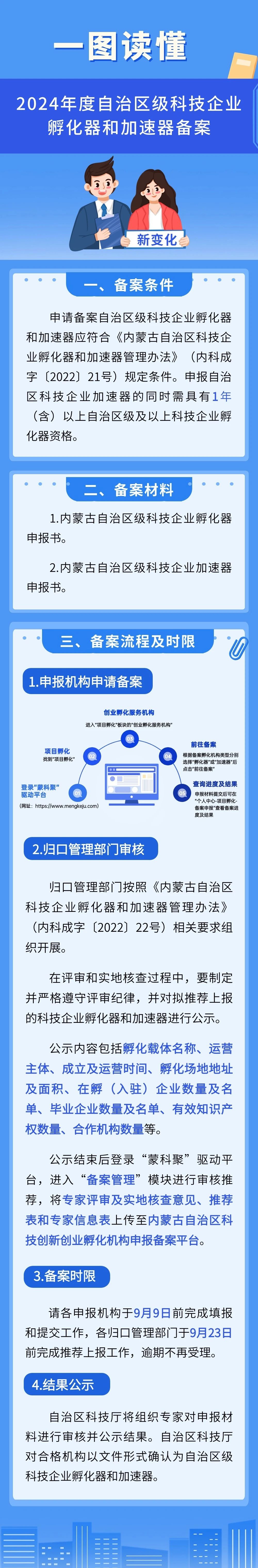为深入实施科技“突围”工程,全面落实2024年全区科技工作会议精神,完善科技创业孵化全要素、全链条服务体系,促进科技创业带动就业,加快自治区科技创新创业高质量发展,亚洲博彩平台推荐推行自治区级科技企业孵化器和加速器备案“全程无纸电子化”业务办理,充分发挥“蒙科聚”创新驱动平台“放管服”改革重要支撑作用,进一步简化备案流程、提高效率,持续优化营商环境,激发创新主体活力。
