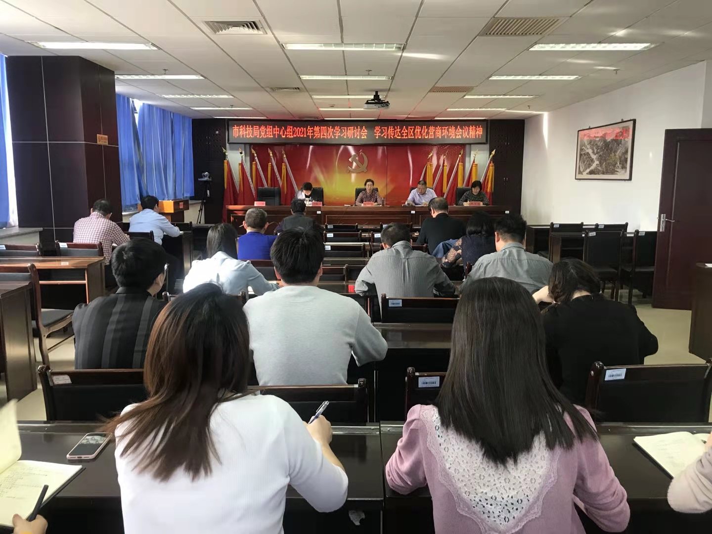 2月20日,乌兰察布市科技局党组书记陈丽云主持召开党组中心组2021年第四次学习研讨会,学习传达全区优化营商环境会议精神。局领导班子成员,机关全体党员干部、局属各事业单位副科以上干部和各党支部书记参加了会议。