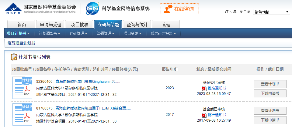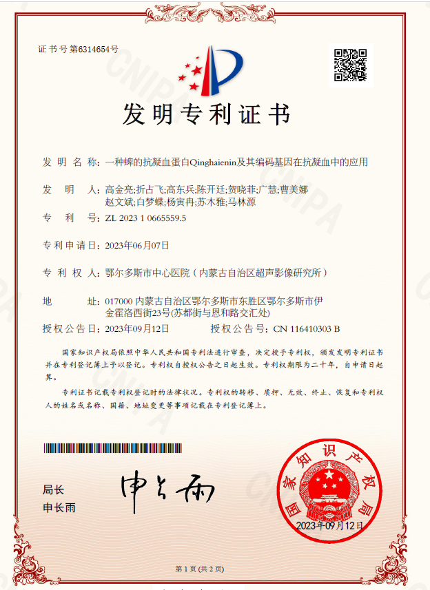 其中1项为鄂尔多斯市中心医院分子医学实验室项目:青海血蜱碱性尾巴蛋白Qinghaienin选择性抑制内源性凝血途径的作用机制研究,项目批准号:82360406。