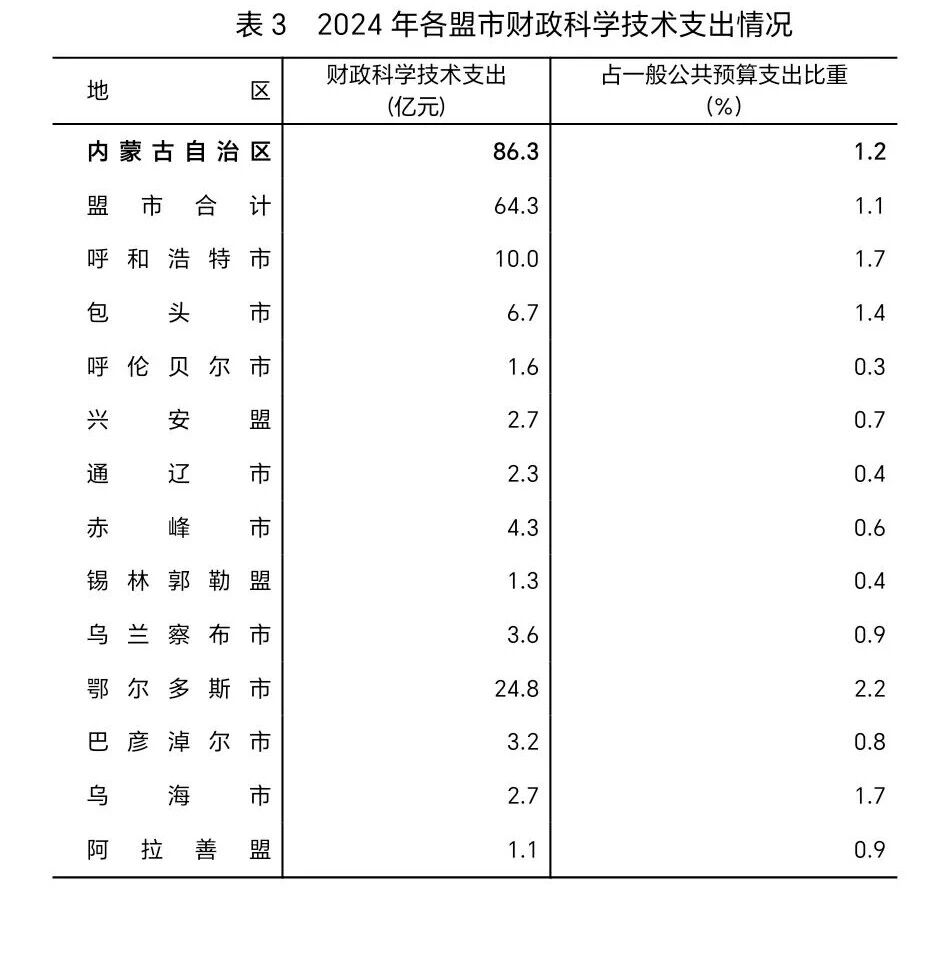 2024年,全区财政科学技术支出86.3亿元,比上年增加11.3亿元,增长15.1%(剔除一次性支出因素后增长20%),占全区一般公共预算支出的比重为1.2%。其中:自治区本级财政科学技术支出22.0亿元,增长3.0%(剔除一次性支出因素后增长19.9%),占自治区本级一般公共预算支出的比重为2.0%[5];盟市财政科学技术支出64.3亿元,增长20.0%,占盟市一般公共预算支出的比重为1.1%。